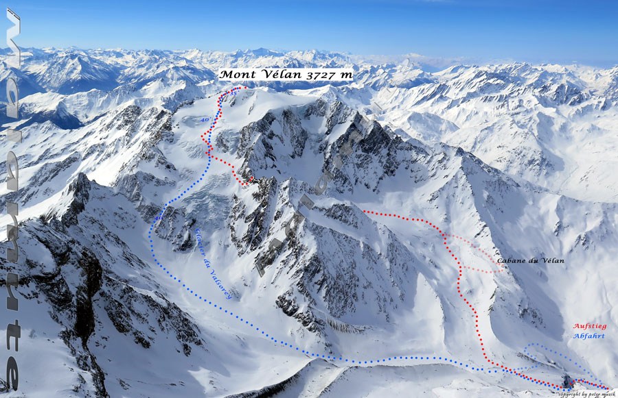 Verlauf: Wanderweg in Richtung Cordonne, durch das Valsorrey, am Chalet d en Bas und Chalet d Amont zu der Cabane du Velan. Von der Hütte am Glasier du Tseudet zu Col de la Gouille, Kletterpasage II, Ketten vorhanden, falls nicht unterm Schneee. Hier weiter auf dem Glasier du Valsorey an der Seracwänden im großen Linkssbogen zum Gipfel.