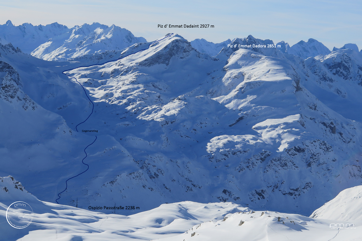 Verlauf: Ospizio - Leg Grevasalvas (hier geht es 60 hm zum See runter (zurück ein Gegeneinstieg), weiter in Richtung Fuorcla Grevasalvas, Bis dato verfolgt die Aufstiegsspur den Wanderweg nach Gravasalvas und Maloja. Am Punkt 2620 m verlässt die Aufsiegsspur den Wanderweg zu der Fuorcla, rechts in den Osthang des Piz d' Emmat Dadaint.